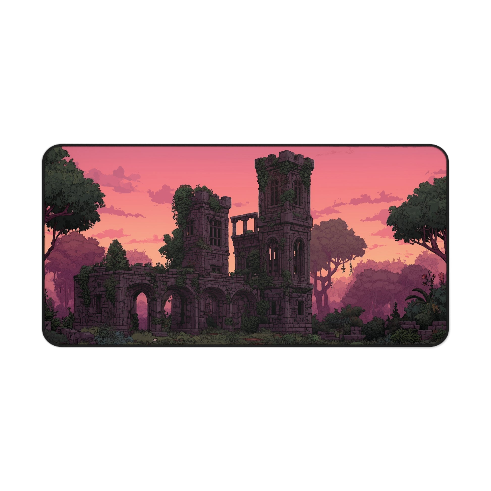 This is a gothic fantasy desk mat featuring a pixel art scene of an abandoned stone castle, overgrown with moss and ivy, set against a dreamy pink sunset sky. It’s the perfect blend of nostalgia and mood—a piece that adds personality to your workspace without going overboard.