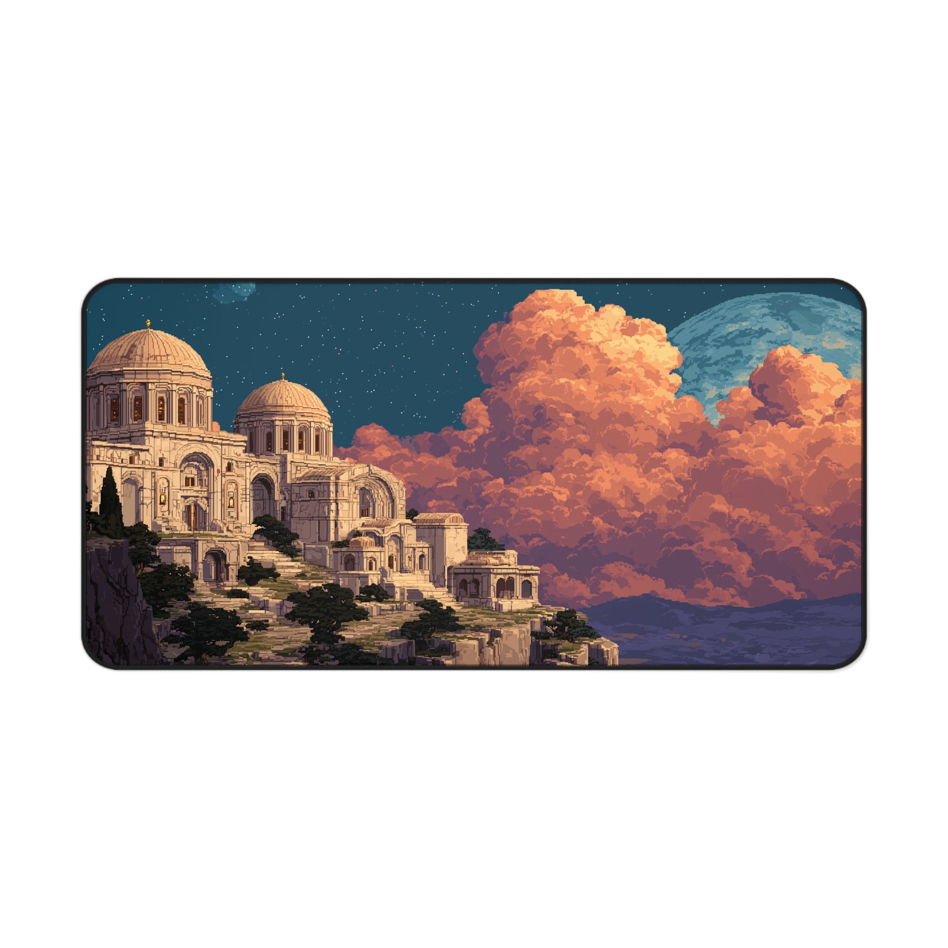 Bring epic architecture and fantasy skies to your desk with this pixel art desk mat. Featuring a grand ancient city built into a cliffside, glowing clouds, and a moonlit sky, this extended desk pad adds a majestic vibe to any setup.