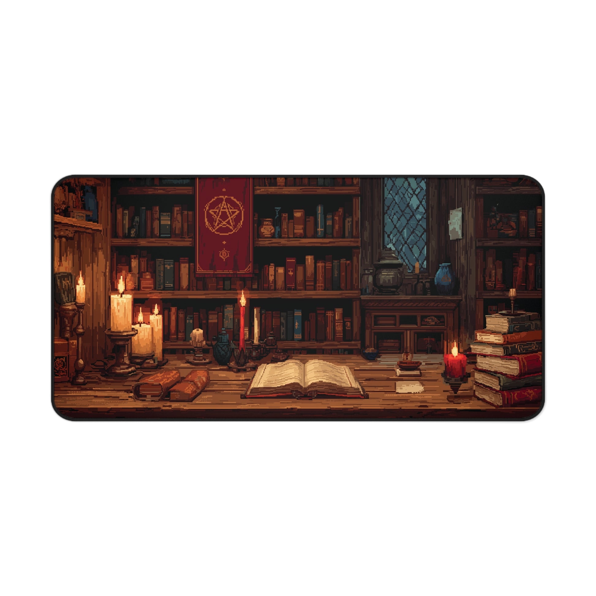 Step into a world of candlelight, ancient books, and quiet magic with this pixel art desk mat. Featuring a richly detailed wizard’s study with glowing candles, spellbooks, and shelves full of secrets, this desk pad brings cozy fantasy vibes to your setup.