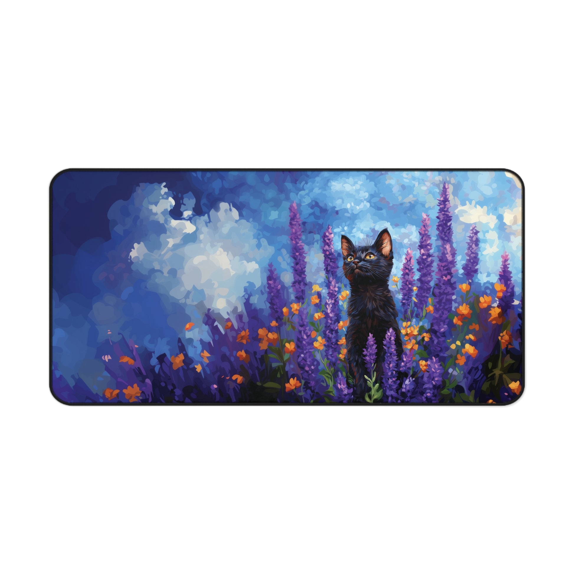 This vibrant Cat Lavender Desk Mat is a stunning piece of functional art that brings beauty and charm to your workspace. Featuring a curious black cat surrounded by tall lavender stems and bright orange flowers under a dreamy, painterly blue sky, this design exudes tranquility and elegance.