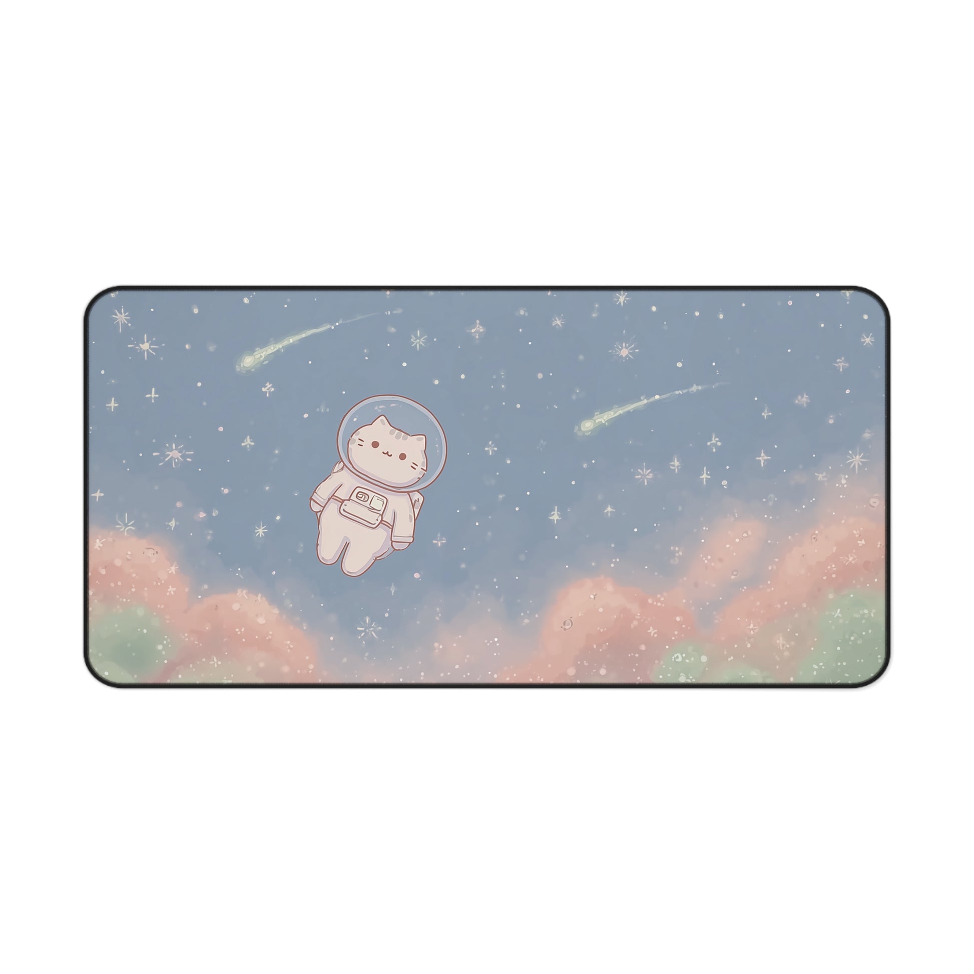 With soft blues, pinks, and minty greens, this mat brings a calm and whimsical vibe to any workspace. The shooting stars and gentle clouds create a magical background for the chubby space kitty, making this the perfect blend of cute and celestial.