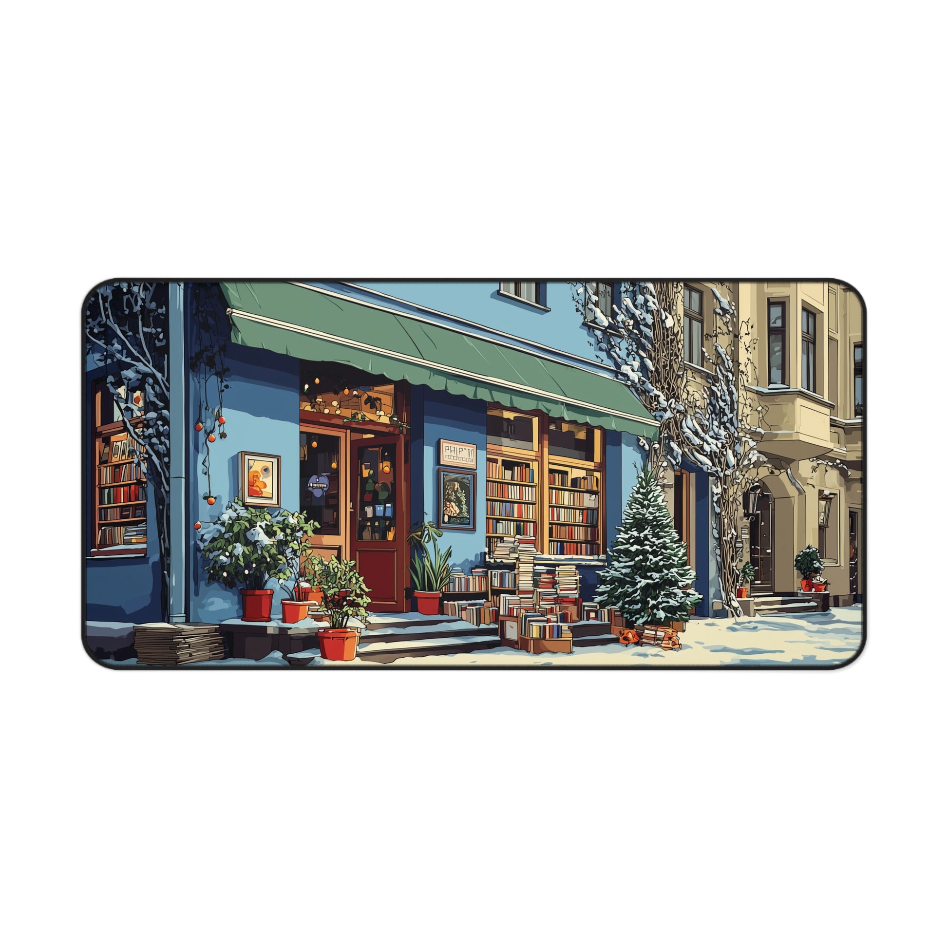 Step into a story every time you sit at your desk with this cozy winter bookstore desk mat. The design captures a charming little shop aglow with warm light, snowflakes drifting past the windows, and shelves stacked with treasures for every book lover. Outside, frosted streets and softly lit lamps set the perfect seasonal mood.