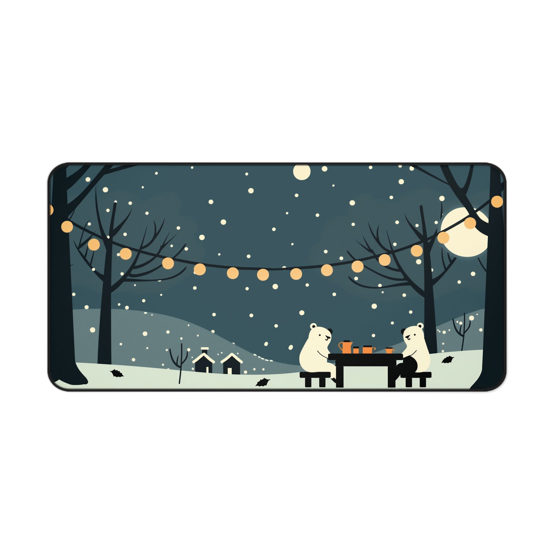 This Christmas and winter desk mat brings a cozy, storybook scene right to your workspace. Featuring two adorable polar bears sharing hot drinks under twinkling string lights, it captures the magic of snowy nights and holiday warmth.