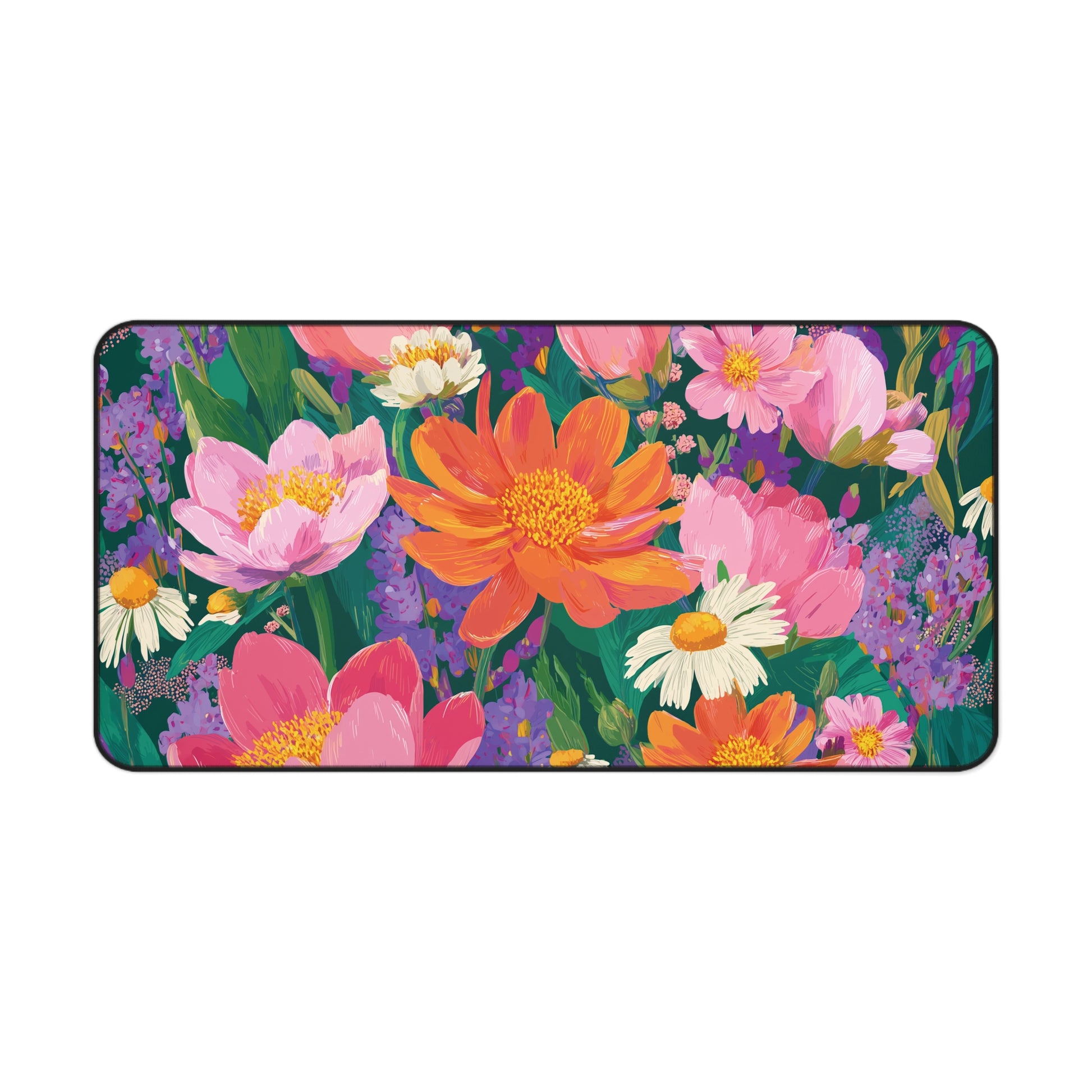 This wildflower desk mat is basically a cheerful garden party for your desk. It features an explosion of hand-painted blooms in bold oranges, soft pinks, daisies, and lavender—all dancing across a rich green backdrop.