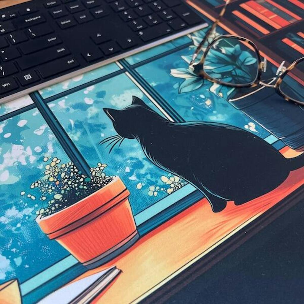 Flanked by bookshelves filled with colorful spines, this Library Cat and Plants Keyboard Mat creates a serene and intellectual atmosphere, perfect for any workspace. Available in XXL and large sizes, this Aesthetic Mouse Pad provides plenty of space for your keyboard, mouse, and accessories, making it ideal for gaming, studying, or working. Its smooth surface ensures precise mouse control, while the non-slip backing offers stability during use.