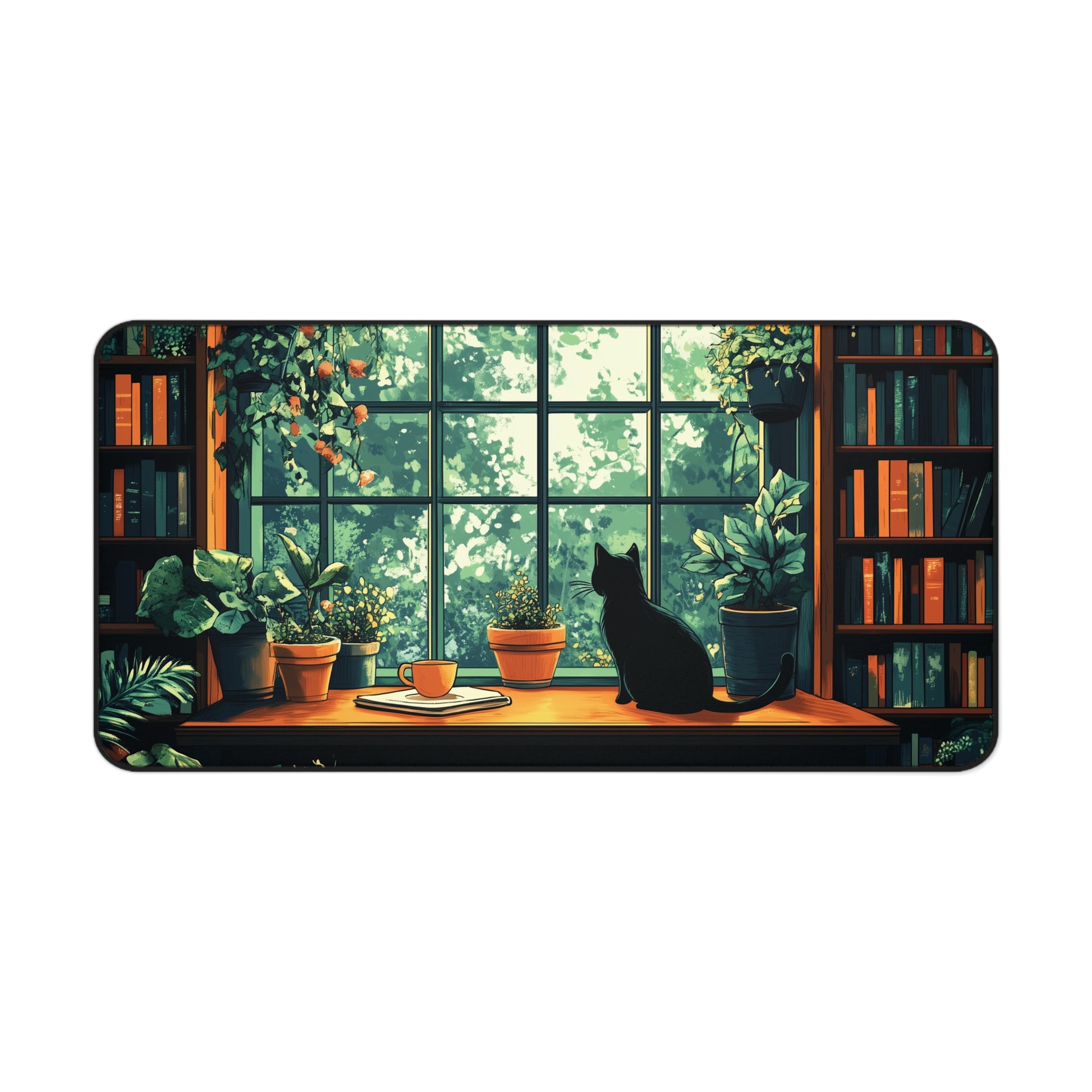 This charming Cat Library Desk Mat combines the cozy vibes of a lofi aesthetic with the elegance of Dark Academia. The design features a black cat perched on a wooden desk, surrounded by lush potted plants and framed by a picturesque window overlooking a verdant garden.