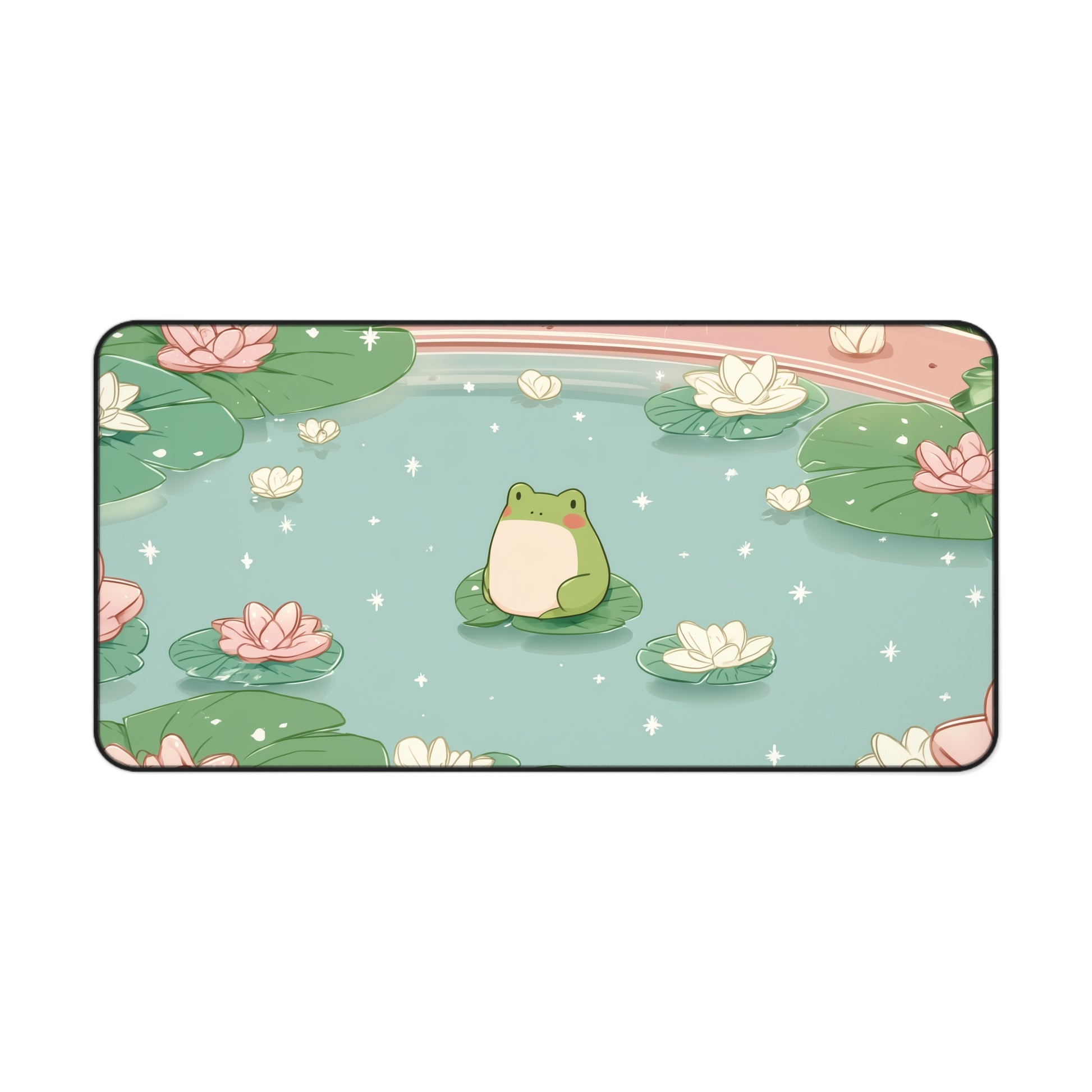 Level up your desk decor with this kawaii desk mat featuring a charming cartoon frog relaxing on a lily pad surrounded by sparkling water and blooming lotus flowers.