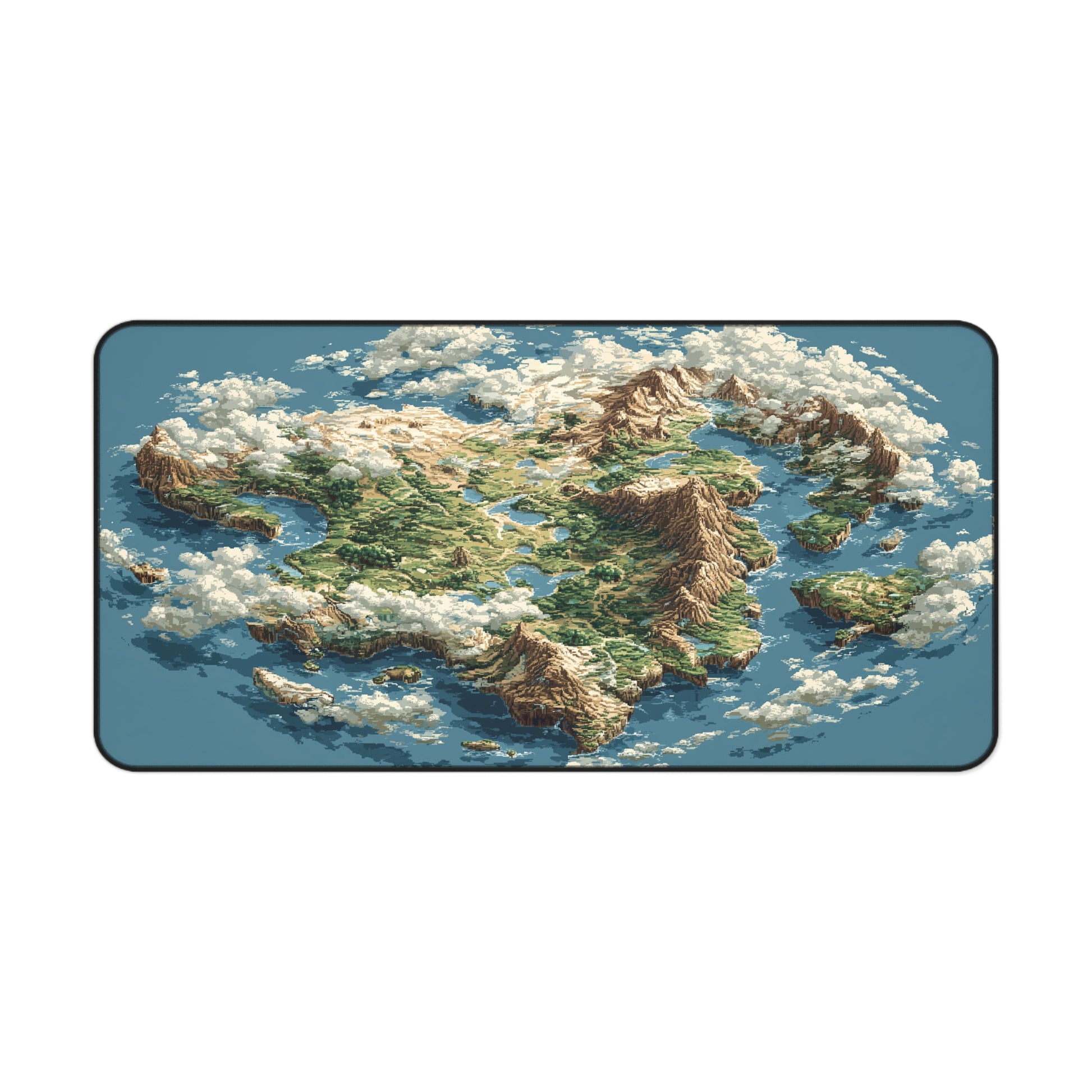 Bring your desk to life with this epic pixel art map of a sprawling fantasy continent. Featuring jagged coastlines, towering mountain ranges, peaceful lakes, scattered islands, and lush valleys, this design looks like it came straight out of a legendary RPG or a fantasy author’s notebook.