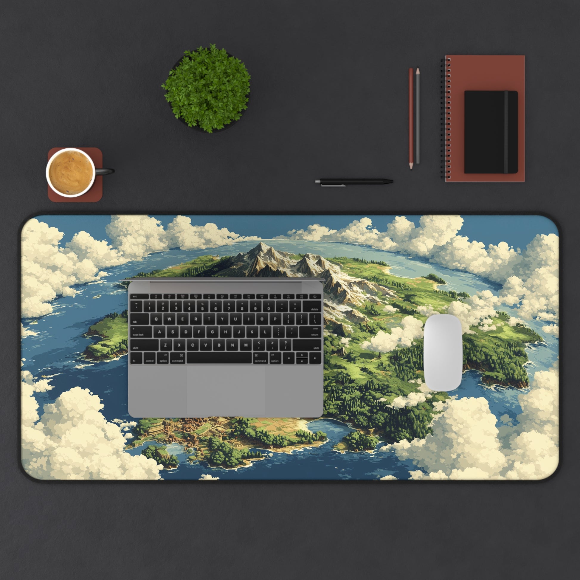 This fantasy desk mat features a breathtaking pixel art map of a lush island kingdom, complete with snow-capped mountains, dense forests, coastal villages, farmland, and a bustling medieval city.