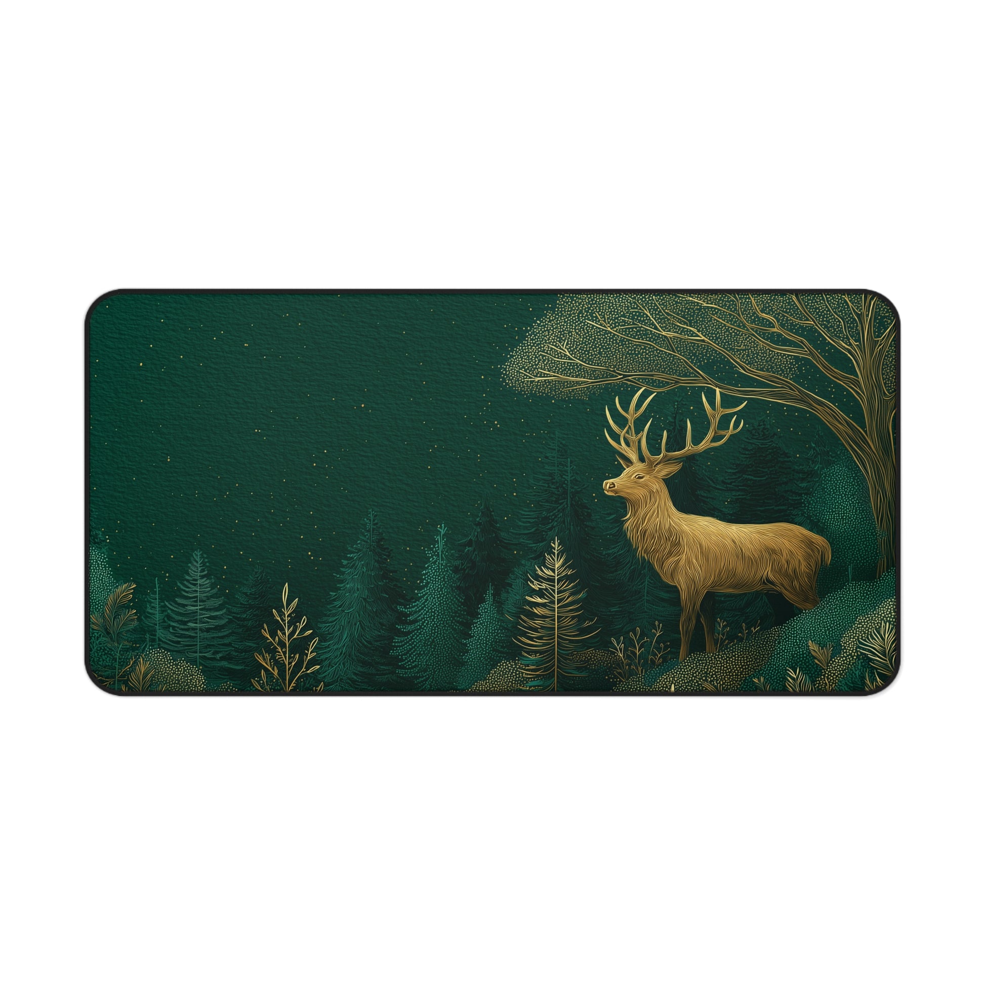 This desk mat features a stunning forest scene with a majestic golden stag standing among deep green pines under a starlit sky. Designed to bring the calm of nature into your workspace, it’s both functional and decorative.