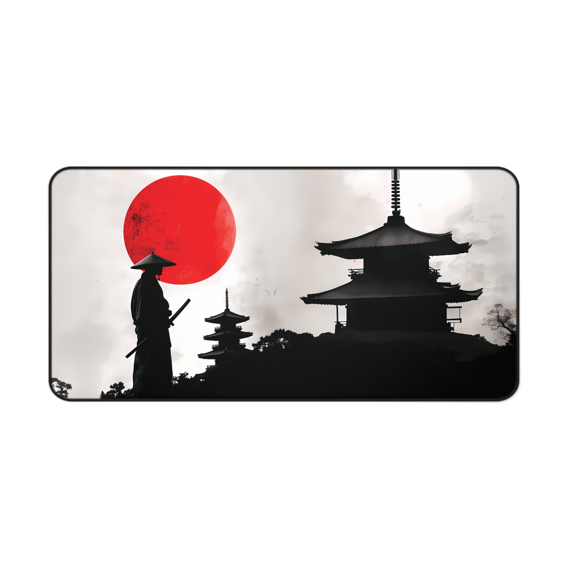 This stunning Japanese Gaming Desk Mat features a captivating black-and-white design with a dramatic red sun, symbolizing the rising sun of Japan. The silhouette of a samurai, clad in traditional attire and holding a katana, stands in serene contrast against the detailed pagoda temples in the background.