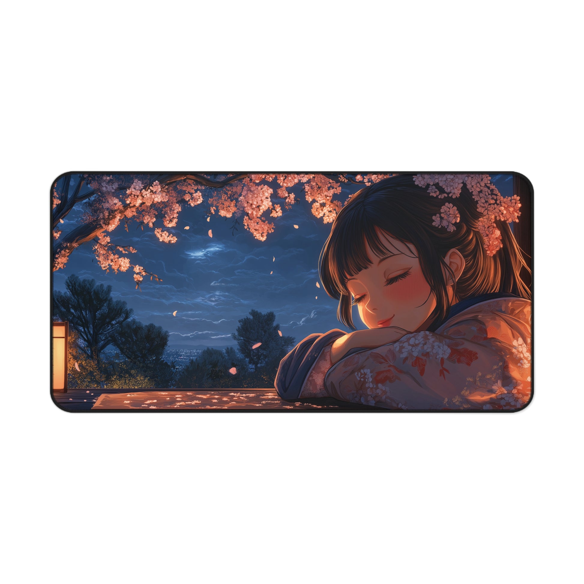 This Japanese cherry blossom anime desk mat features a dreamy illustration of a peaceful girl in a kimono resting beneath sakura trees under the night sky. Perfect for anime lovers, gamers, and desk decor enthusiasts, it transforms any setup into a cozy, aesthetic haven.