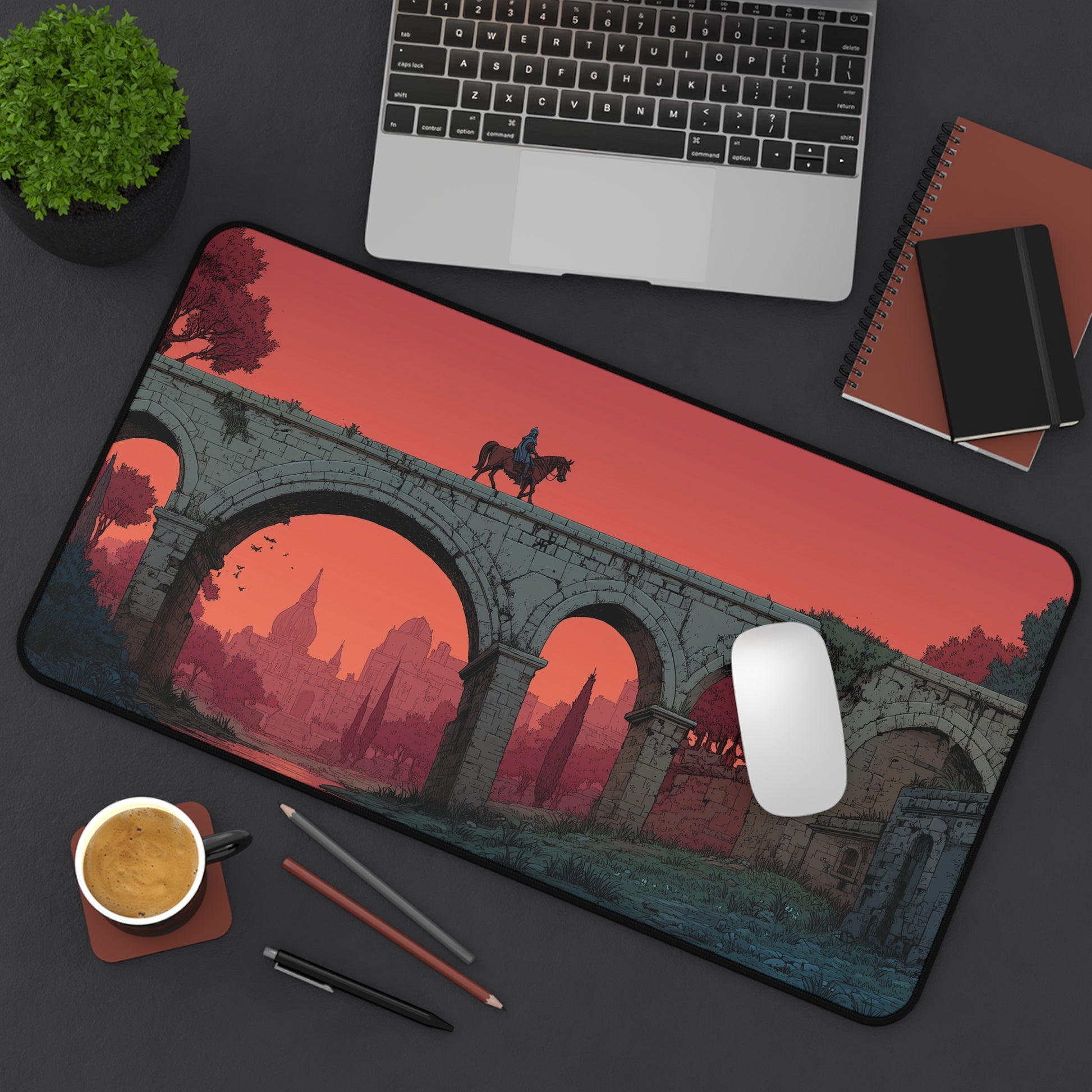 This gaming desk mat showcases a pixel art scene of a wandering knight crossing a ruined stone bridge at dusk, set against the backdrop of a crumbling castle city bathed in dramatic twilight.