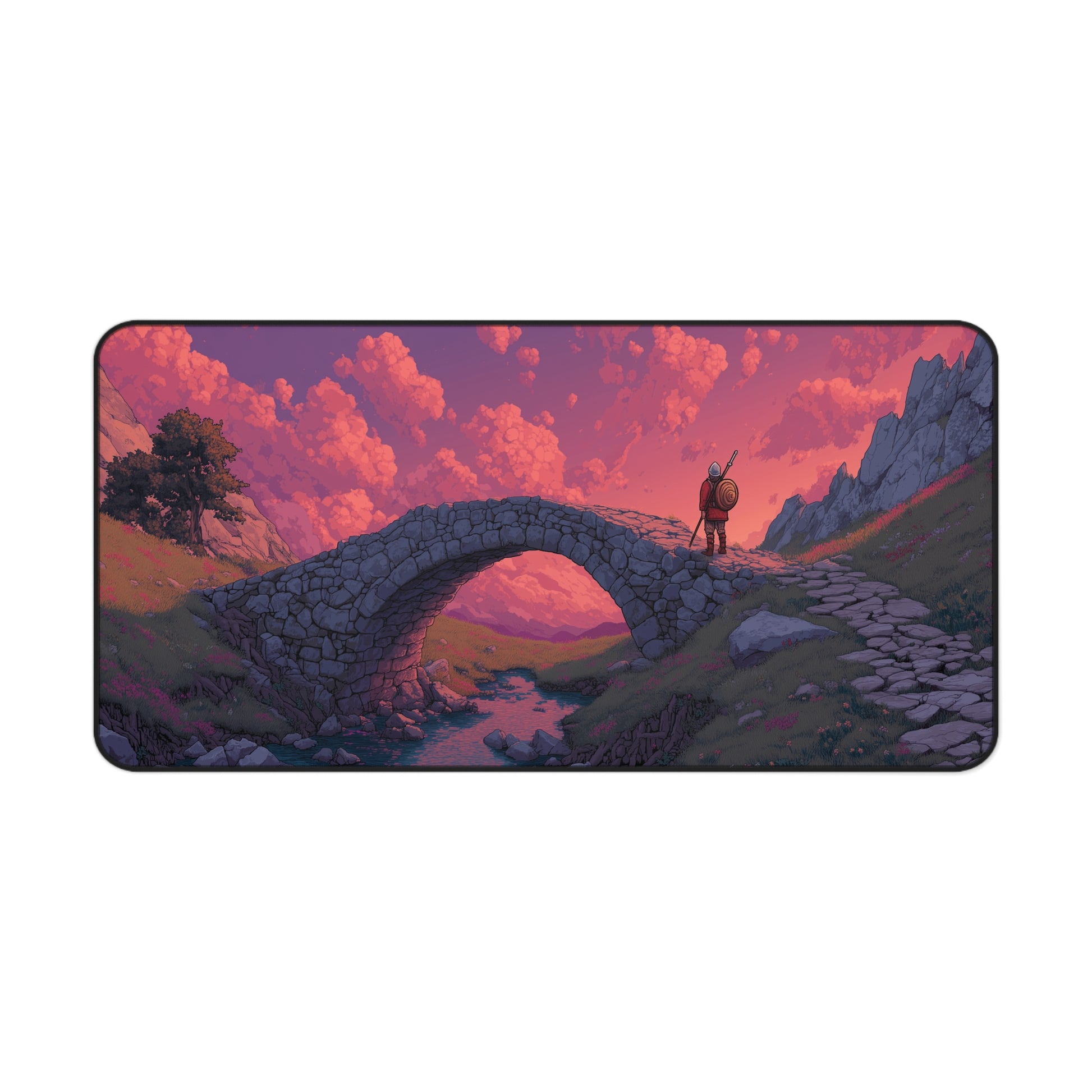 This gaming desk mat captures a peaceful yet powerful moment: a wandering knight stands on a weathered stone bridge, gazing into a glowing horizon. Set against a sky filled with warm pink clouds and nestled in a quiet mountain valley, this scene brings both fantasy and calm to your desk space.