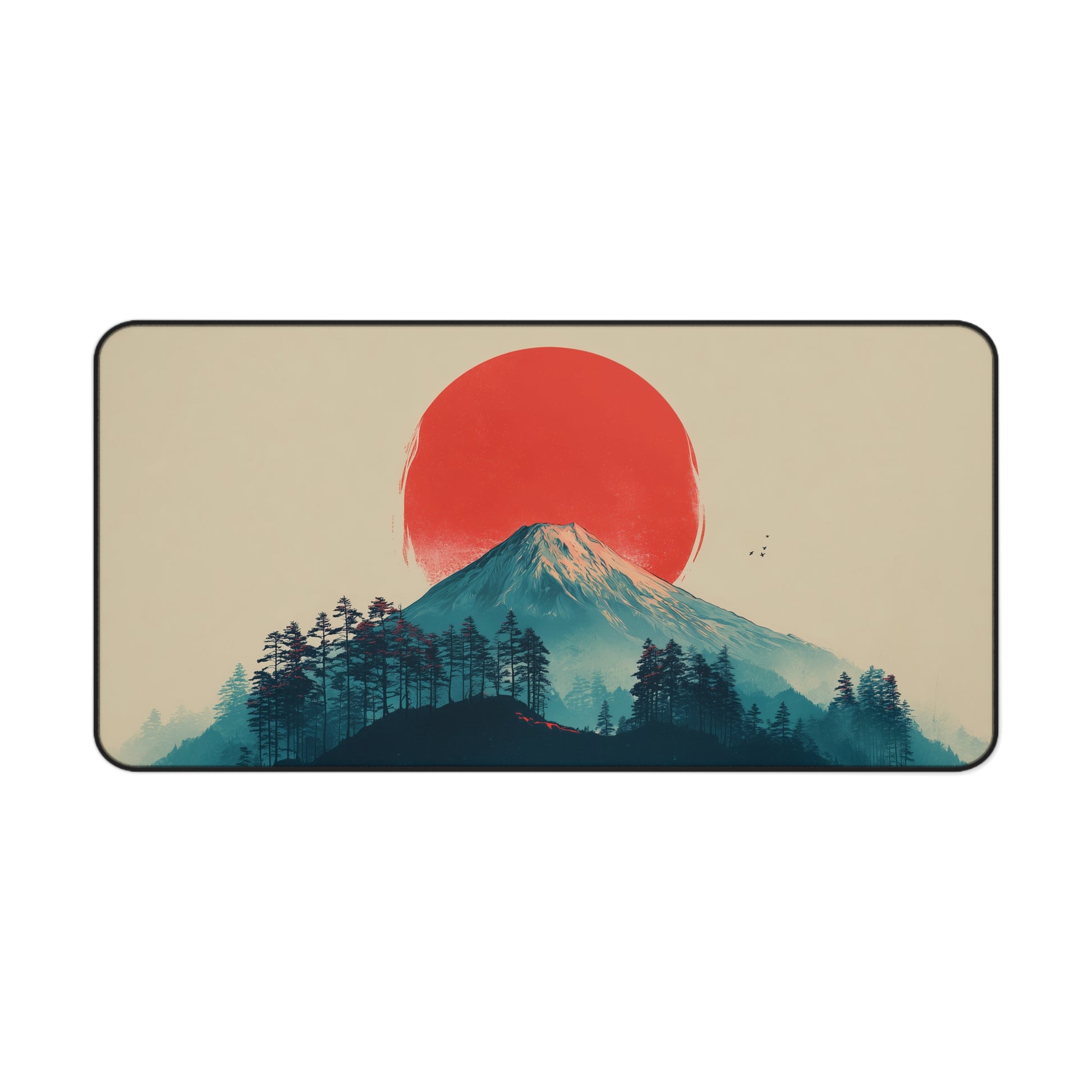 This desk mat features a bold and striking design: Mt. Fuji silhouetted against a vivid red rising sun.