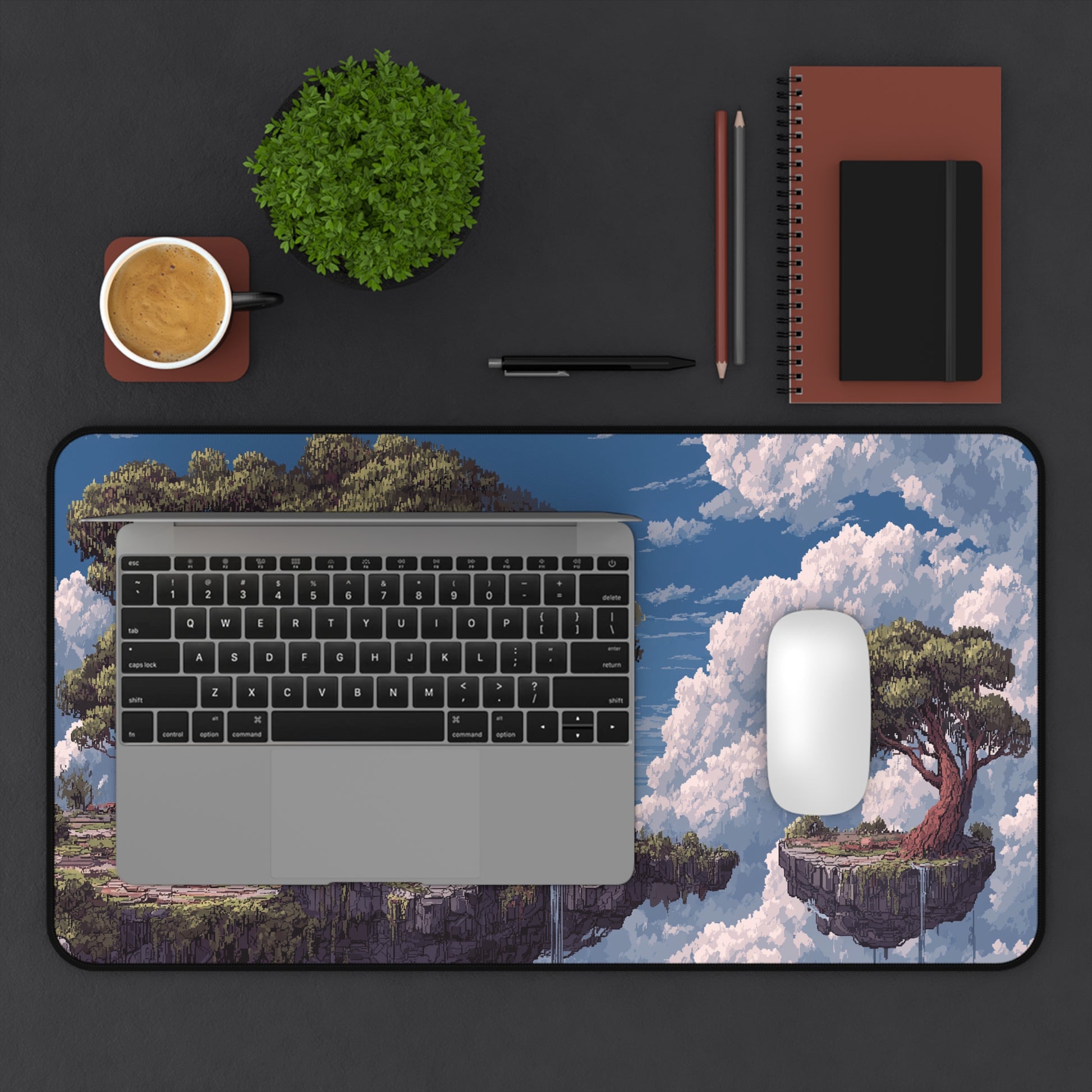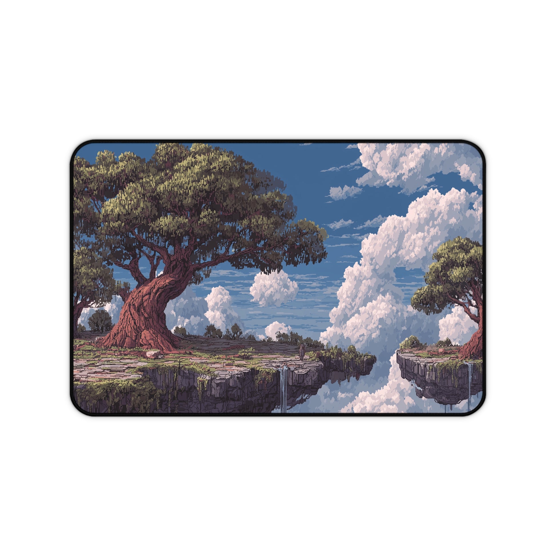This pixel art desk mat features a stunning floating island landscape with giant trees, designed for both gamers and workspace lovers. The ultra-wide layout works perfectly as an extended desk pad, keyboard mat, or large mouse pad XL.