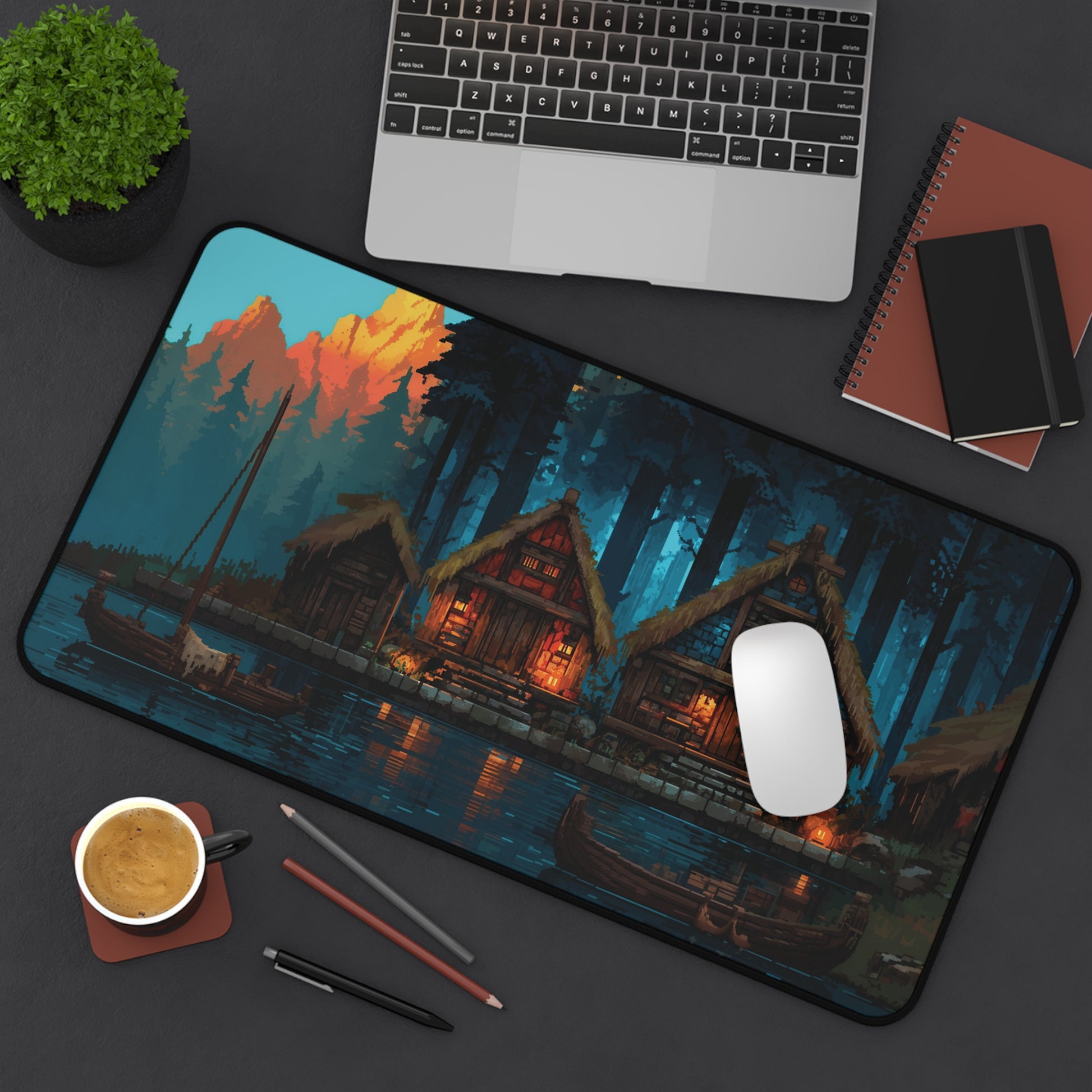 This Pixel Art Desk Mat features a cozy village tucked at the edge of a dark forest – glowing warmly in the night, like something straight out of a fantasy RPG.