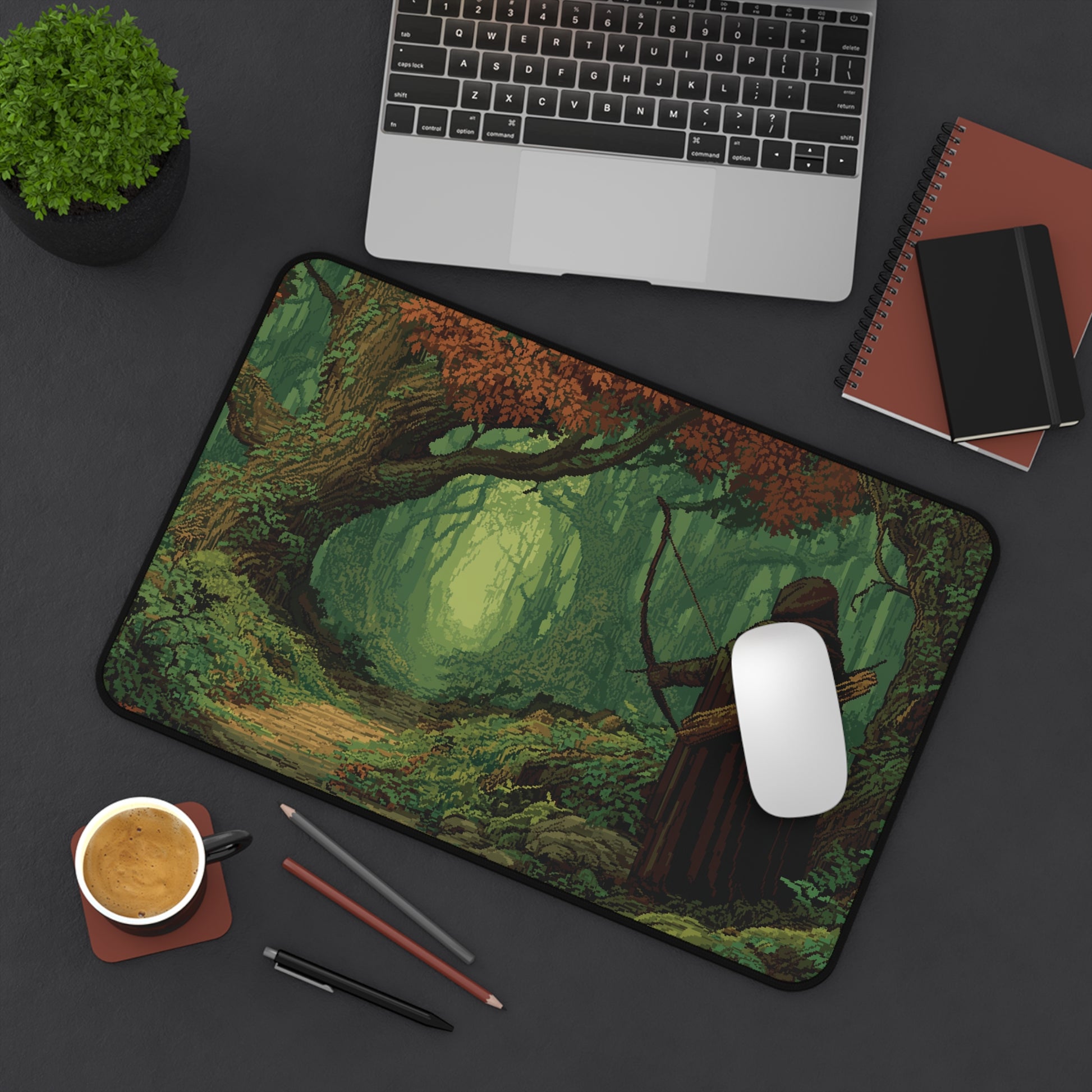 Step into the heart of a mystical forest with this pixel art desk mat—featuring a cloaked ranger aiming toward a glowing forest path. The detailed pixel scenery feels like a quest waiting to happen, making this extended desk pad a perfect match for both gaming setups and creative workspaces.