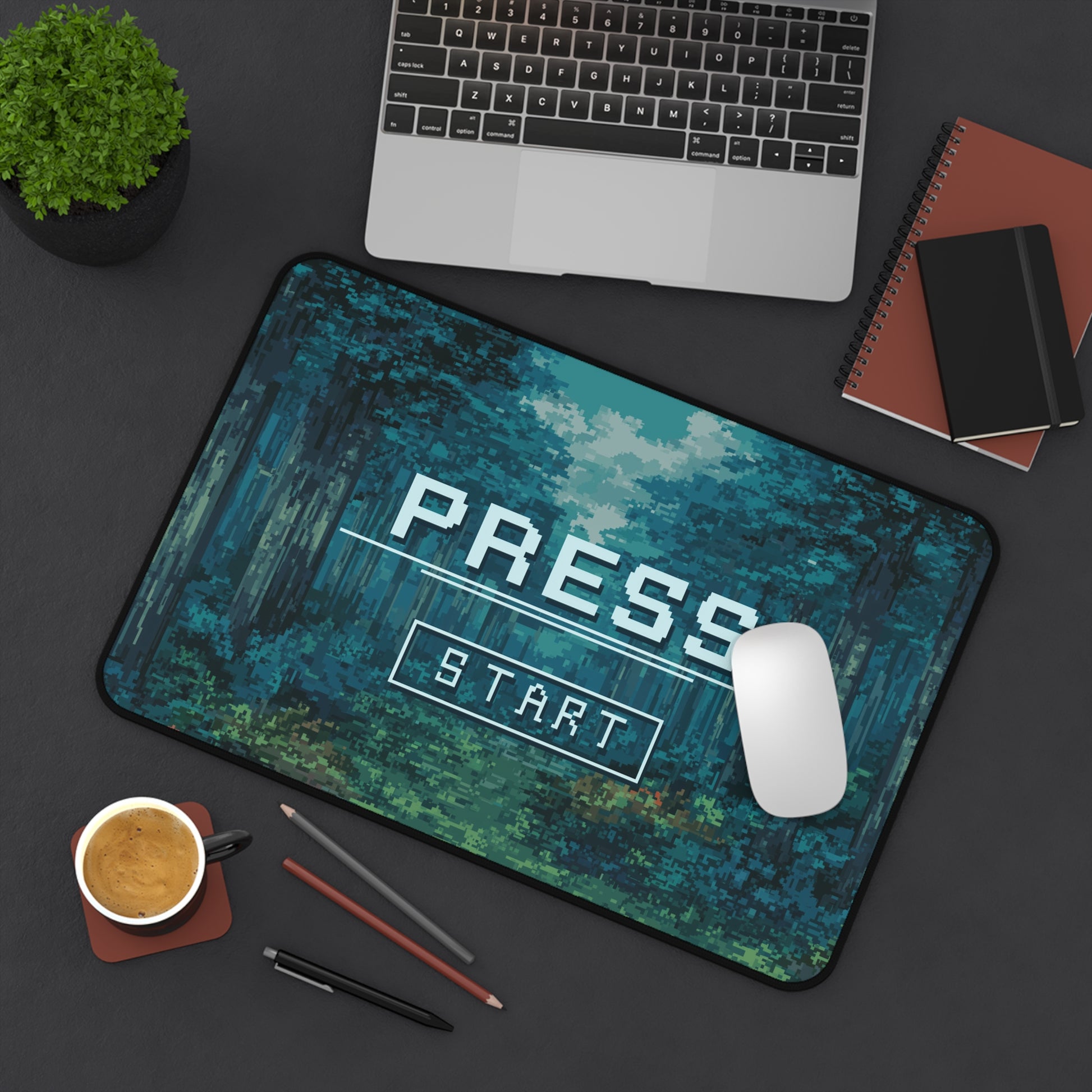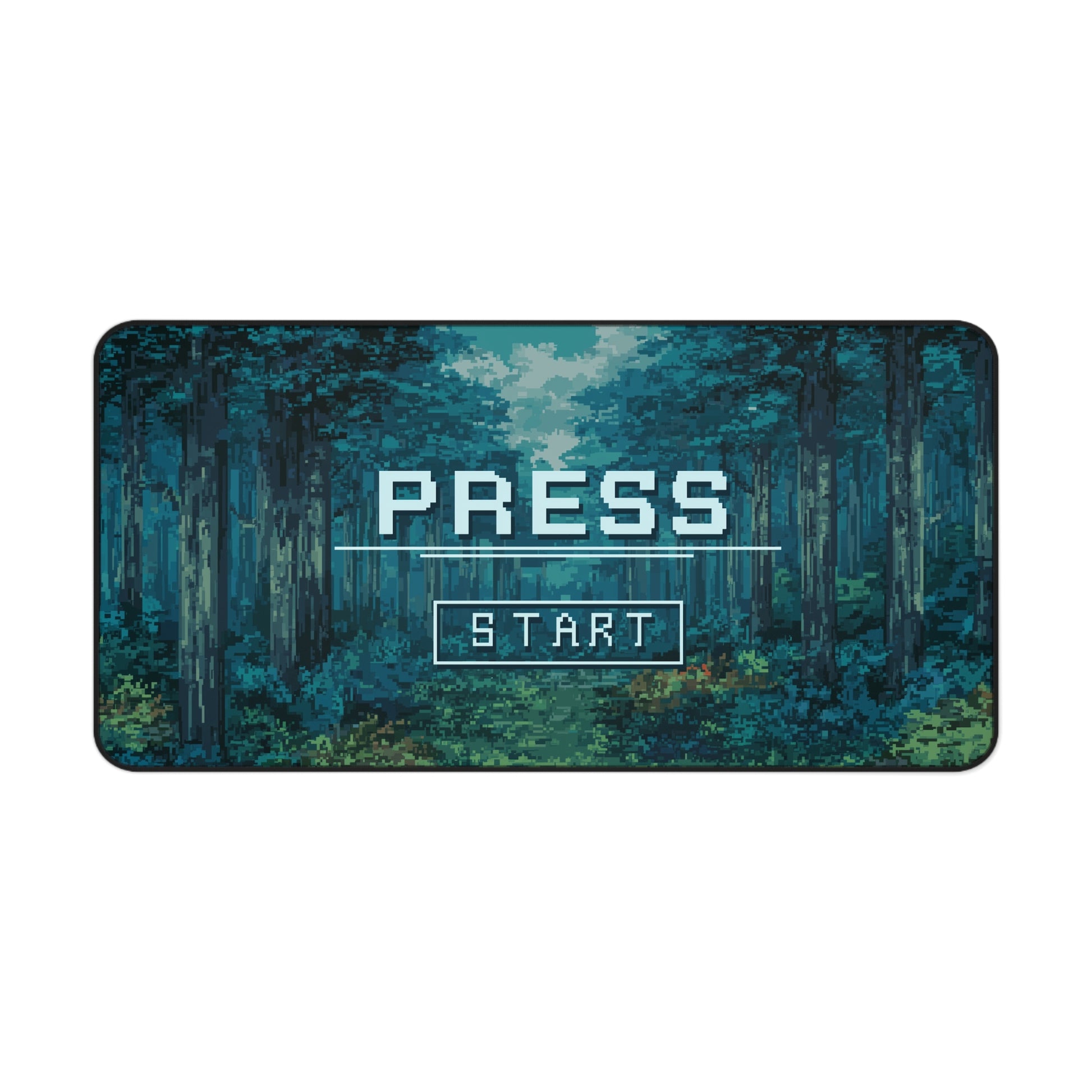 Power up your space with this retro-inspired Press Start pixel art desk mat. Set in a moody forest scene with vintage game-style lettering, it’s a nod to classic RPG intros and startup screens.