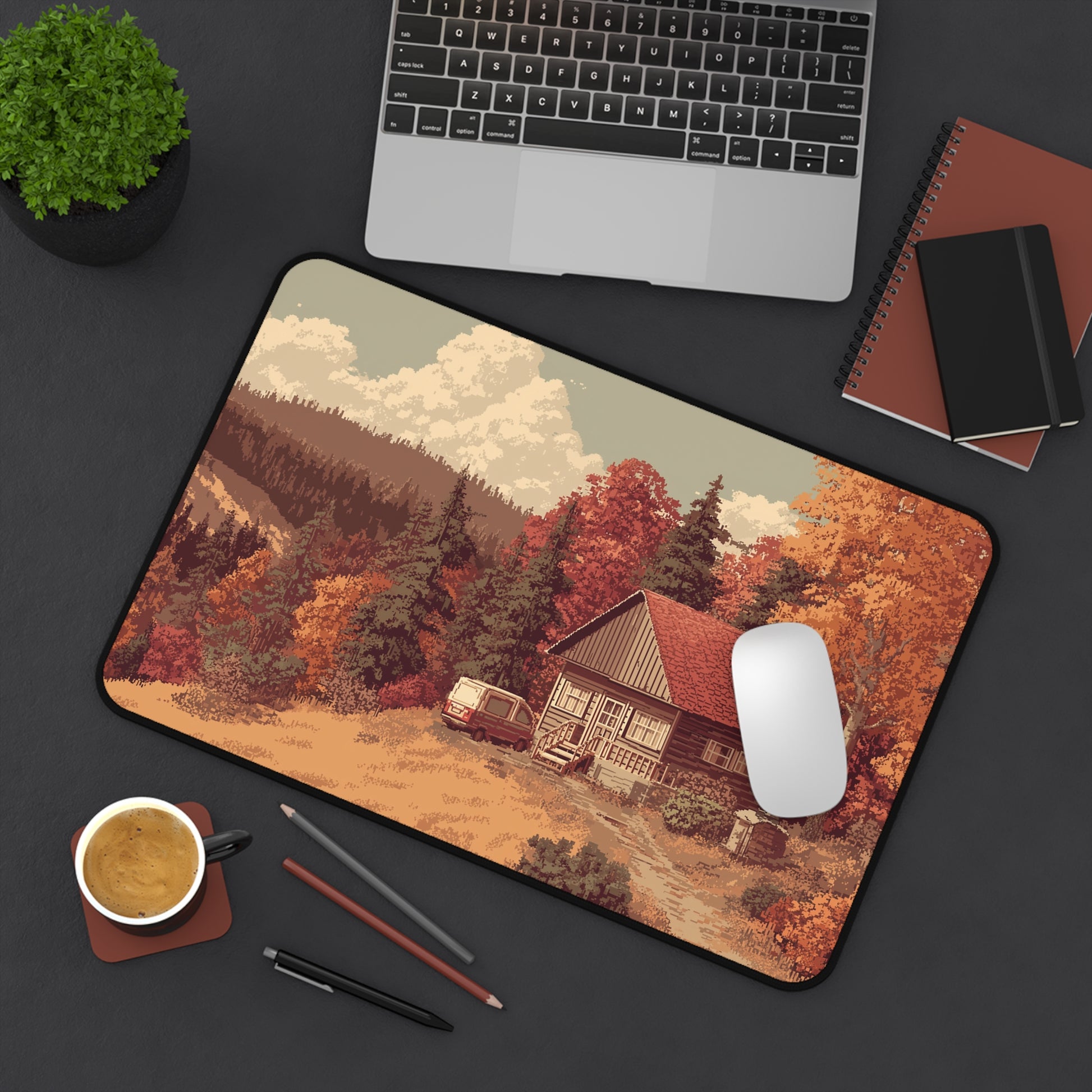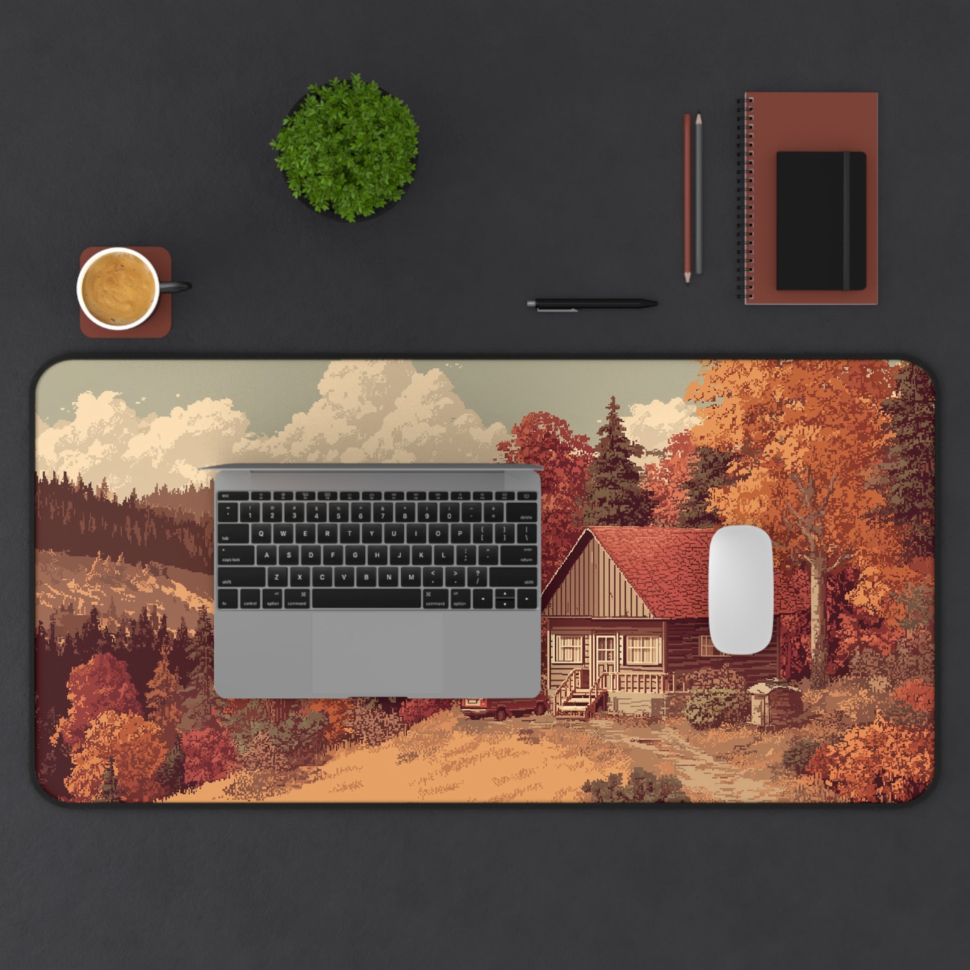 This desk mat features a cozy autumn cabin in the forest, surrounded by golden and red fall trees. A soft nature-inspired pixel art design that brings warmth and calm to your workspace.