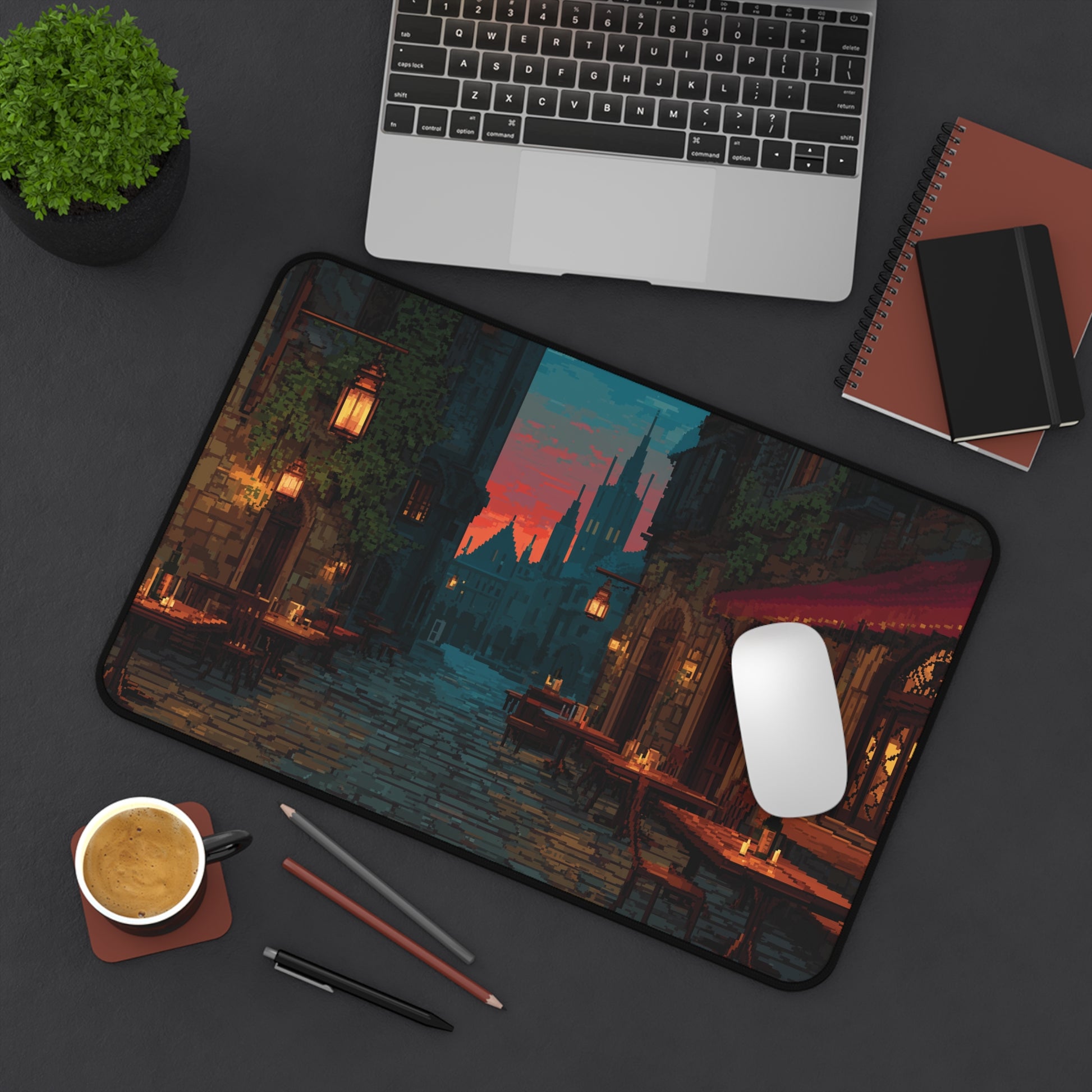 Bring a cozy old-world charm to your workspace with this Pixel Art Medieval City Desk Mat.