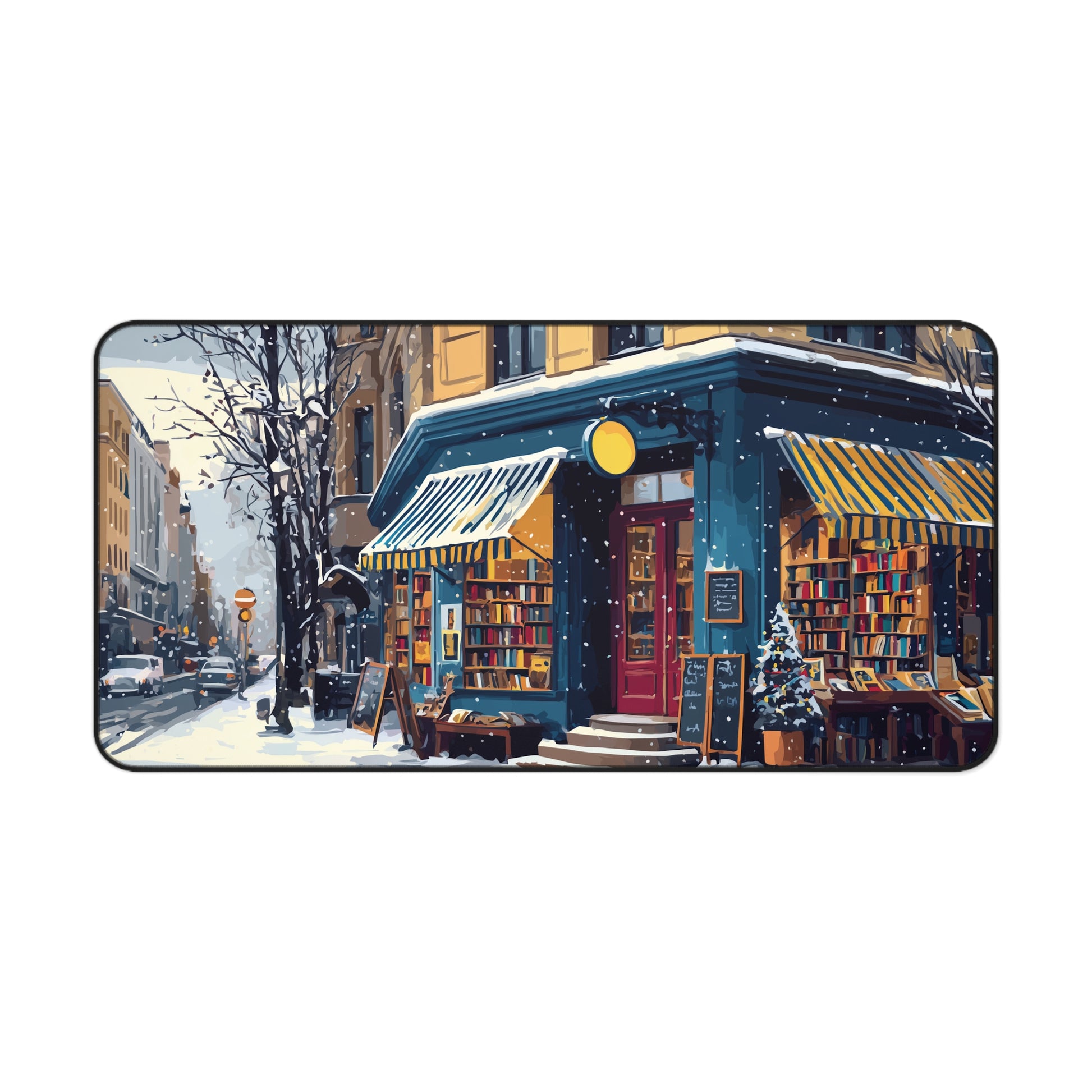 Step into a story every time you sit at your desk with this cozy winter bookstore desk mat.