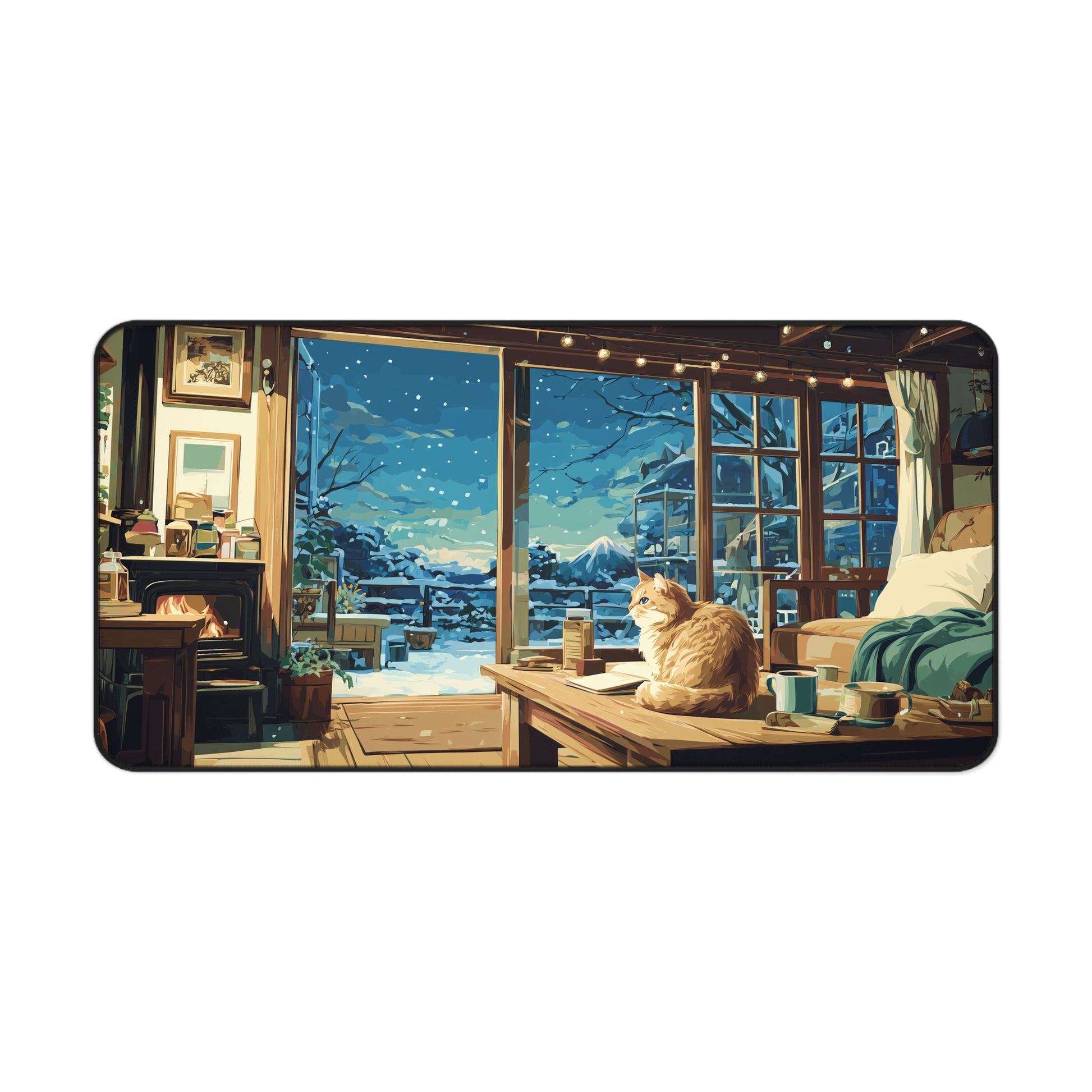 Bring peaceful winter vibes to your workspace with this Ghibli-style desk mat, featuring a cozy indoor scene with a cat gazing out at snow-covered rooftops through a window glowing with twilight. Warm lights, tiny details, and a soft palette make this design feel like a comforting pause in a winter day.